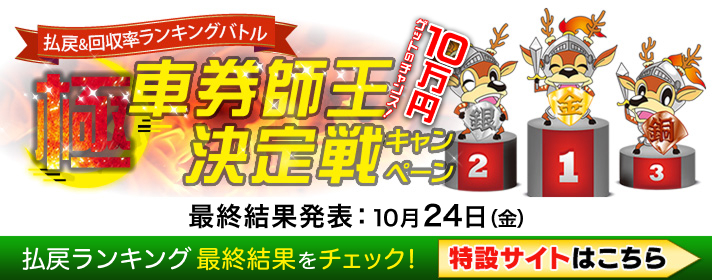 特設サイトにて、払戻&回収率の合計ポイントランキングの結果発表をお知らせいたします。いずれも1位~10位の方のランキングネームと払戻&回収率の合計ポイントを発表いたします。事務局にて不適切と判断したランキングネームは、「非公開さん」に変換する場合があります。予めご了承ください。
